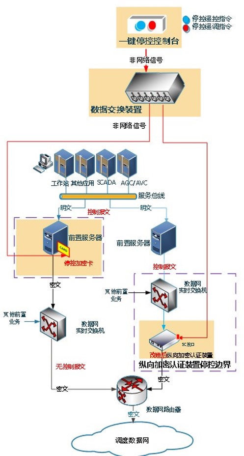 ??乜v向加密認(rèn)證裝置:基于縱向加密認(rèn)證裝置進(jìn)行改造的新型裝置,具備識(shí)別控制臺(tái)指令,用于防止主站網(wǎng)絡(luò)安全事件的影響向廠站大規(guī)模蔓延,默認(rèn)情況下處于縱向加密認(rèn)證裝置的原有工作模式運(yùn)行,緊急情況下可通過(guò)非網(wǎng)絡(luò)方式啟動(dòng)阻斷模式運(yùn)行,阻斷攔截主站下發(fā)廠站的遙控、遙調(diào)命令,以下簡(jiǎn)稱“停控縱向裝置”。