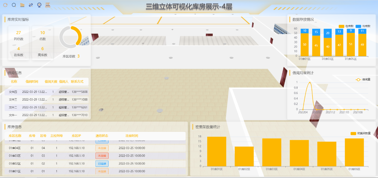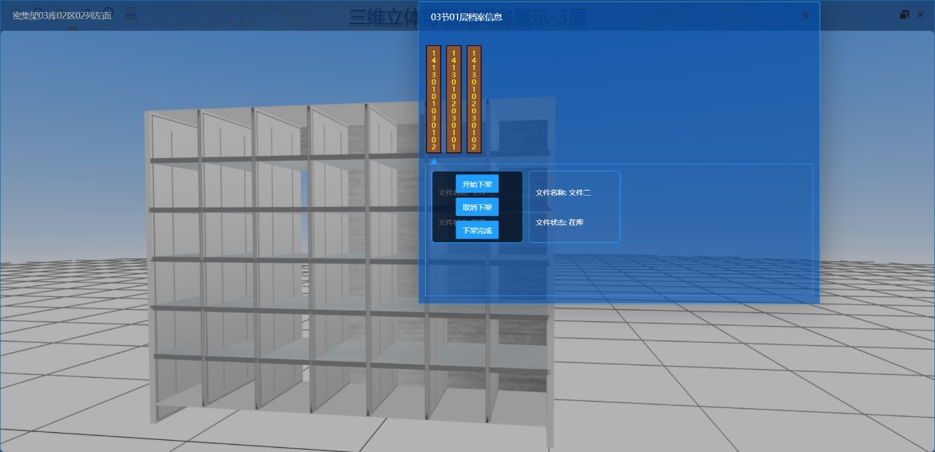 本系統(tǒng)結(jié)合用戶的深度業(yè)務(wù)邏輯,通過Three.Js三維可視化技術(shù)搭建數(shù)字孿生模型,使用IOT技術(shù)、運(yùn)行歷史數(shù)據(jù),多尺度、多概率的仿真過程,在虛擬空間中完成映射,將真實(shí)設(shè)備與數(shù)字模型進(jìn)行耦合交互,實(shí)現(xiàn)設(shè)備實(shí)時運(yùn)行狀態(tài)與數(shù)字孿生對象動作對應(yīng)(支持密集架開啟、關(guān)閉、查詢文件等)。