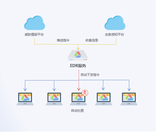 平臺針對安全風險較高的場景(如終端上報了高危安全事件,或觸發了特殊的安全策略)可以快速響應并自動下發處置措施,及時阻斷已知、未知或高級威脅,全面防護企業終端安全。
