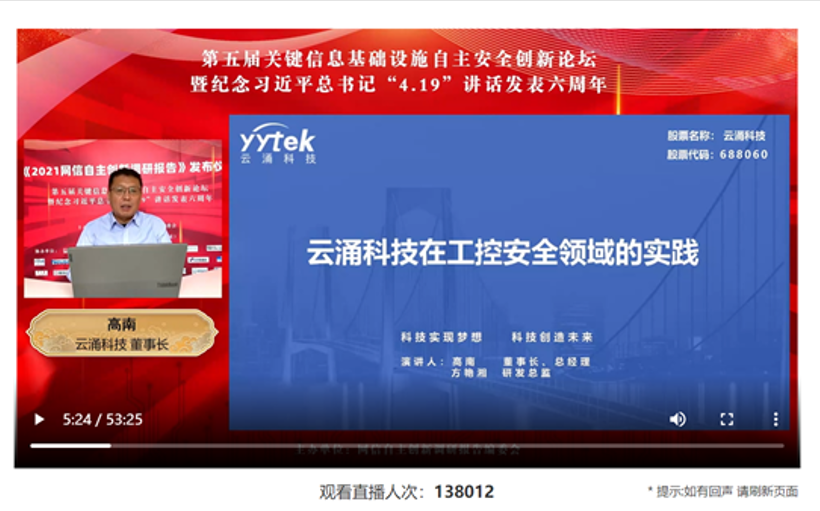 在大會企業線上專場環節,云涌科技董事長高南和研發總監方艷湘,為大會帶來了《云涌科技在工控安全領域的實踐》的精彩演講.