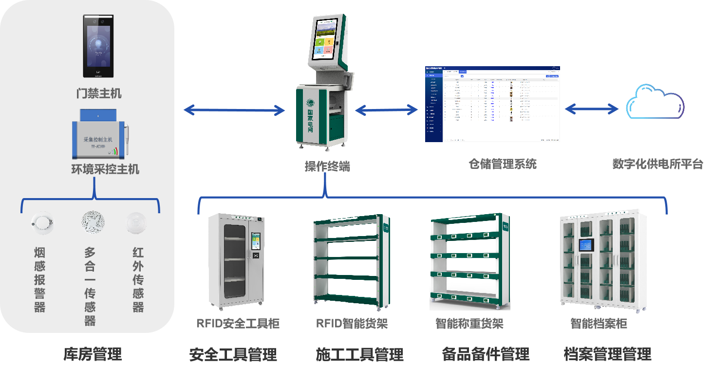 此外為了更好的實現(xiàn)自動控制、智能照明、安全防護以及數(shù)據(jù)分析,針對供電所“四庫“的室內(nèi)存儲環(huán)境管理,我們配有一整套專門的庫房管理系統(tǒng),以及系統(tǒng)配套的輔助設(shè)備,比如操作終端、RFID通道門和標(biāo)簽等,并結(jié)合使用基于物聯(lián)網(wǎng)、云計算等新技術(shù)構(gòu)建的智能一體化管控平臺,系統(tǒng)管理員不僅可以實現(xiàn)對多個庫房的站點管理,還能獲得更加智能化、多元化的管理解決方案。