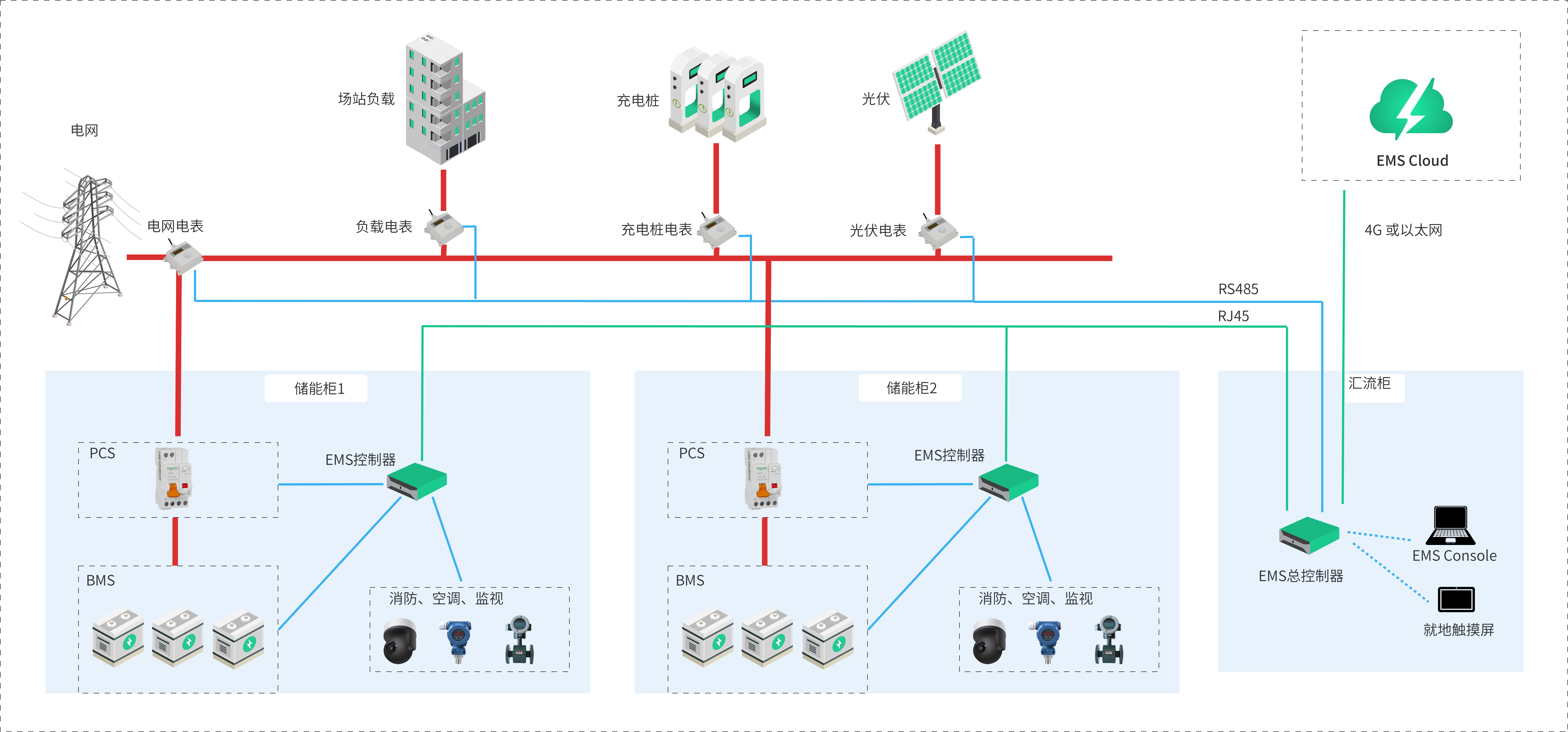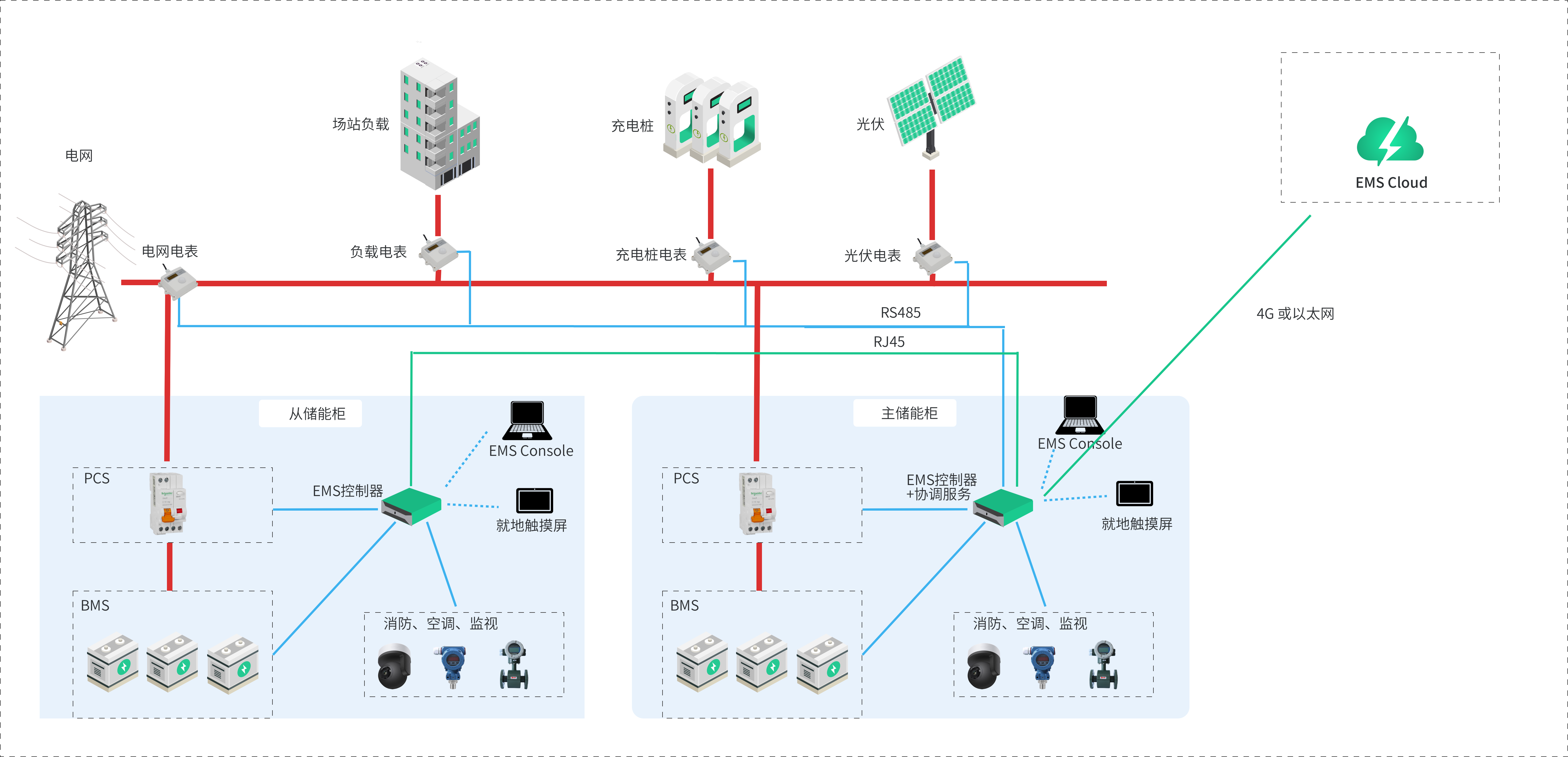 所有柜體內只有一個控制器,并放置于主柜中,主柜EMS控制器通過以太網與所有從柜進行通訊交互,從柜中安裝采集或者轉換裝置,用于在主柜控制器與從柜各組件設備之間做數據轉發。