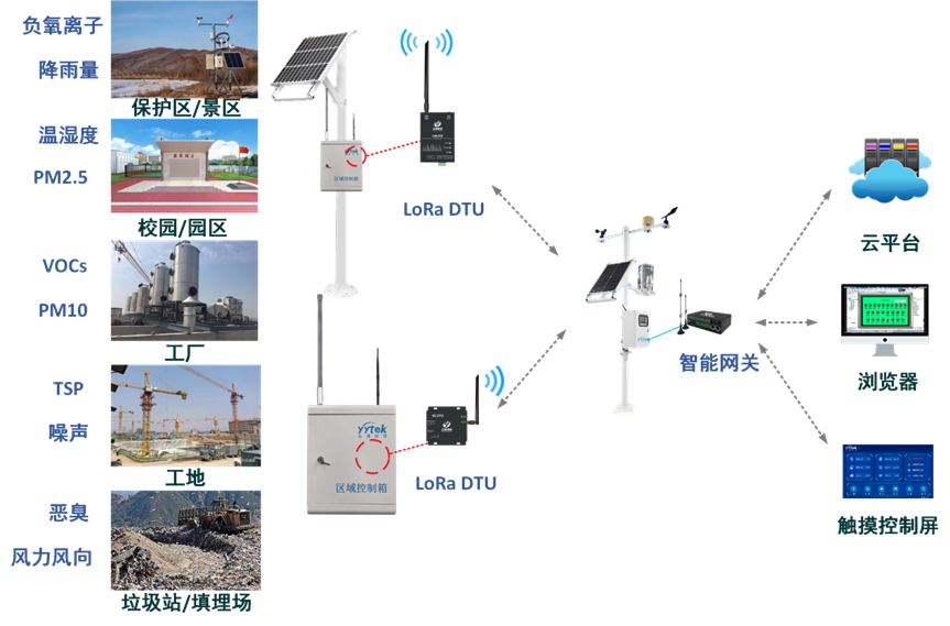 ? ? ? 城市霧霾、工業廢氣污染、尾氣排放、工地揚塵等,都是國家關注和治理的對象,對于這些污染源頭,我們通過環境監測系統,運用傳感采集設備、聯網傳輸設備、數據顯示設備、邊緣計算設備等,實現了對pm2.5、pm10等污染物指數、溫度、濕度、氣壓、噪音、風向、風速等環境參數的采集,并通過物聯通訊設備將這些現場的數據傳輸到智能網關或者遠程服務器上,便于管理人員及時掌握現場監測數據。針對蜂窩數據信號比較好的地區,我們可以使用 LTE DTU將數據直接透傳至平臺,針對偏遠地帶或者信號受屏蔽地區,我們可以采用LoRa DTU進行數據采集和中繼傳輸,然后使用智能網關進行數據處理和環保平臺對接。