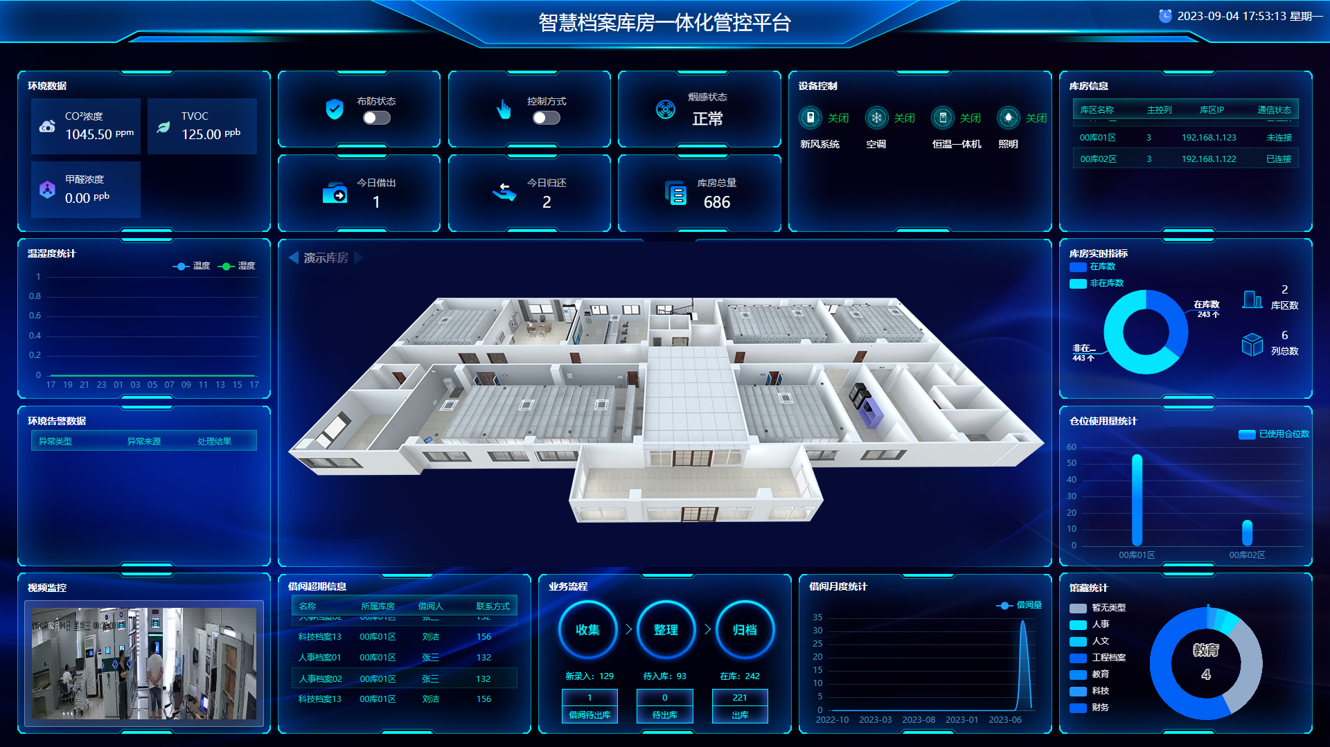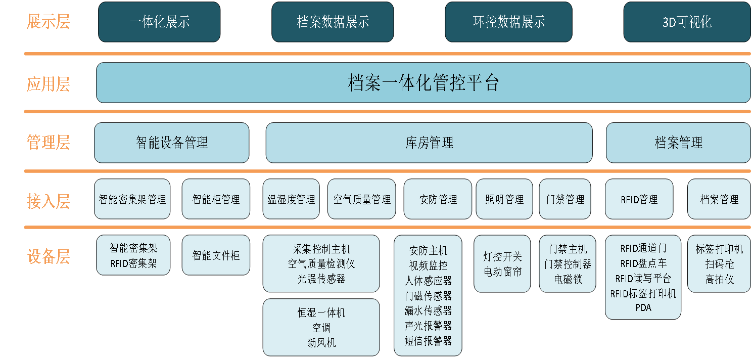 通過一套系統實現庫房內實體檔案管理設備、檔案存儲設備、檔案庫房環境監控設備、檔案庫房安全防范設備等的統一管理。