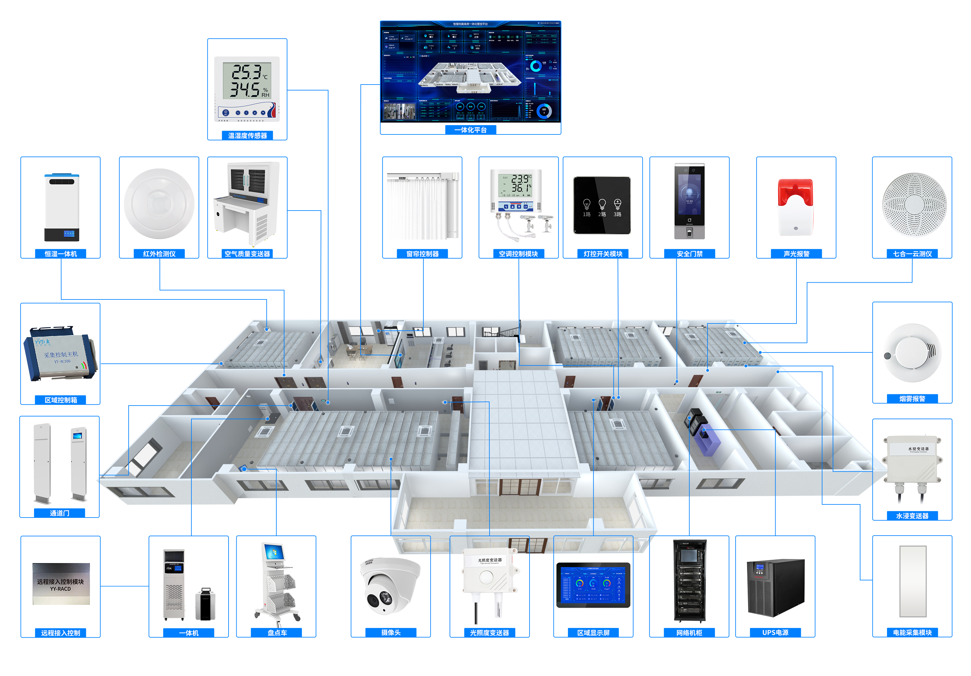 采集所有檔案室內的溫度、濕度、漏水、煙霧、空氣質量、人員侵入等數據,并能夠通過控制空調、凈化一體機等設備,達到自動調節溫濕度及空氣凈化的目的。